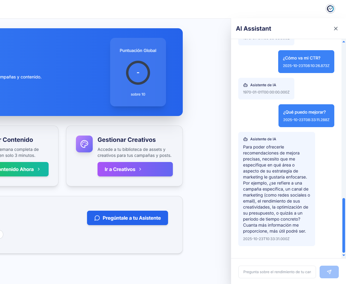 One of the greatest advantages of the Assistant is its ability to access the updated data of your account (campaigns, budget, ROAS). When you ask "How is my CTR?", the assistant consults the metrics of your ad account and answers with the exact value and a contextualized insight.