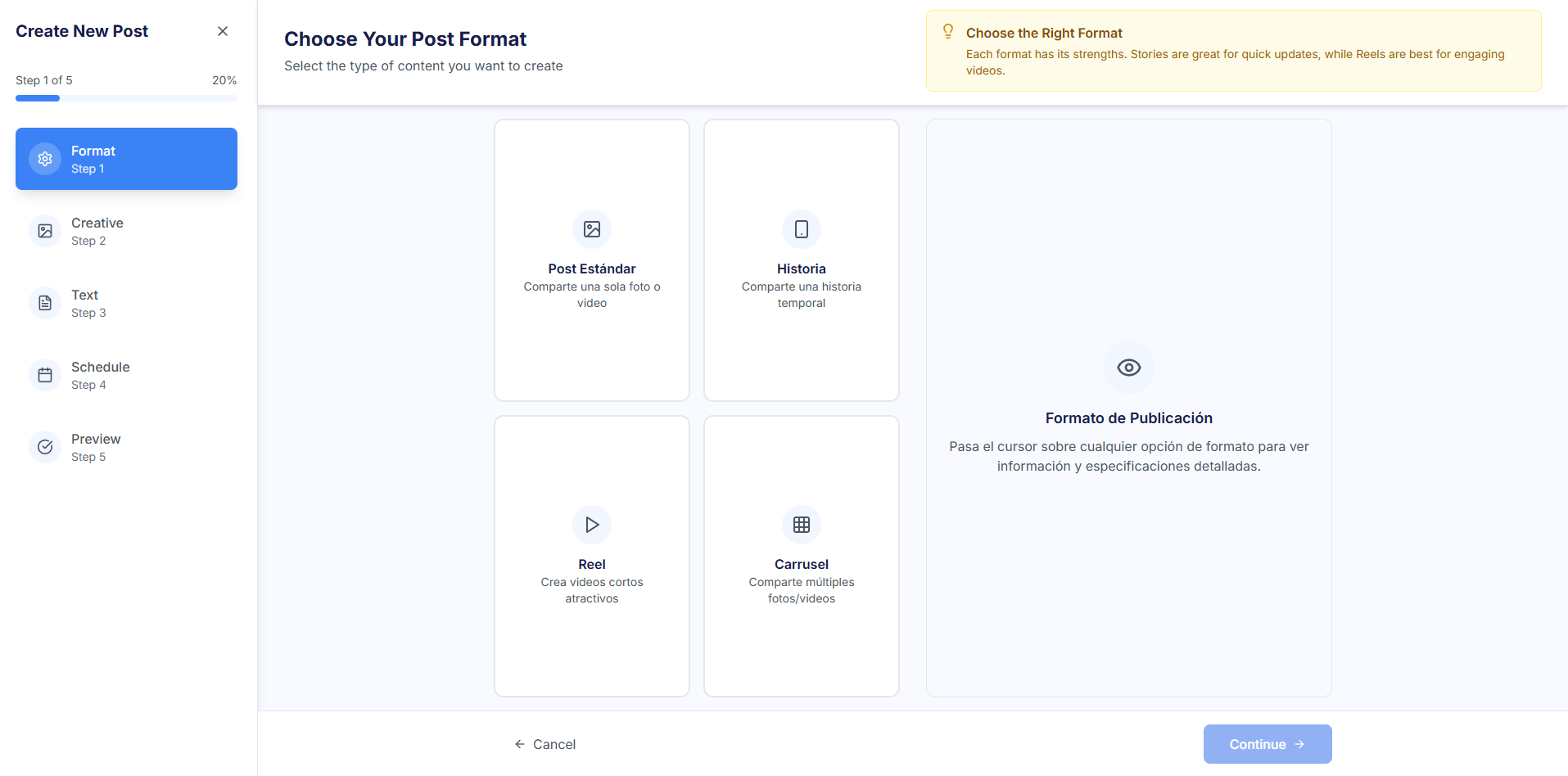 - Format Selection: The user chooses between Single Post (a single image/video), Story, Reel (short video), or Carousel (multiple files).