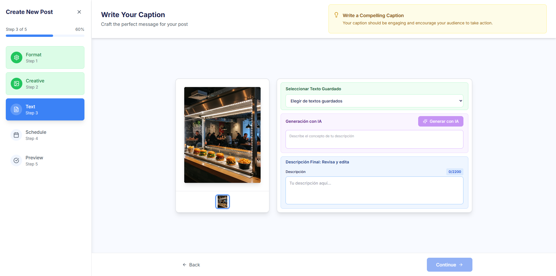 - AI Suggestions: Use the "Generate with AI" button for the AI to suggest a caption based on the context and selected creative.