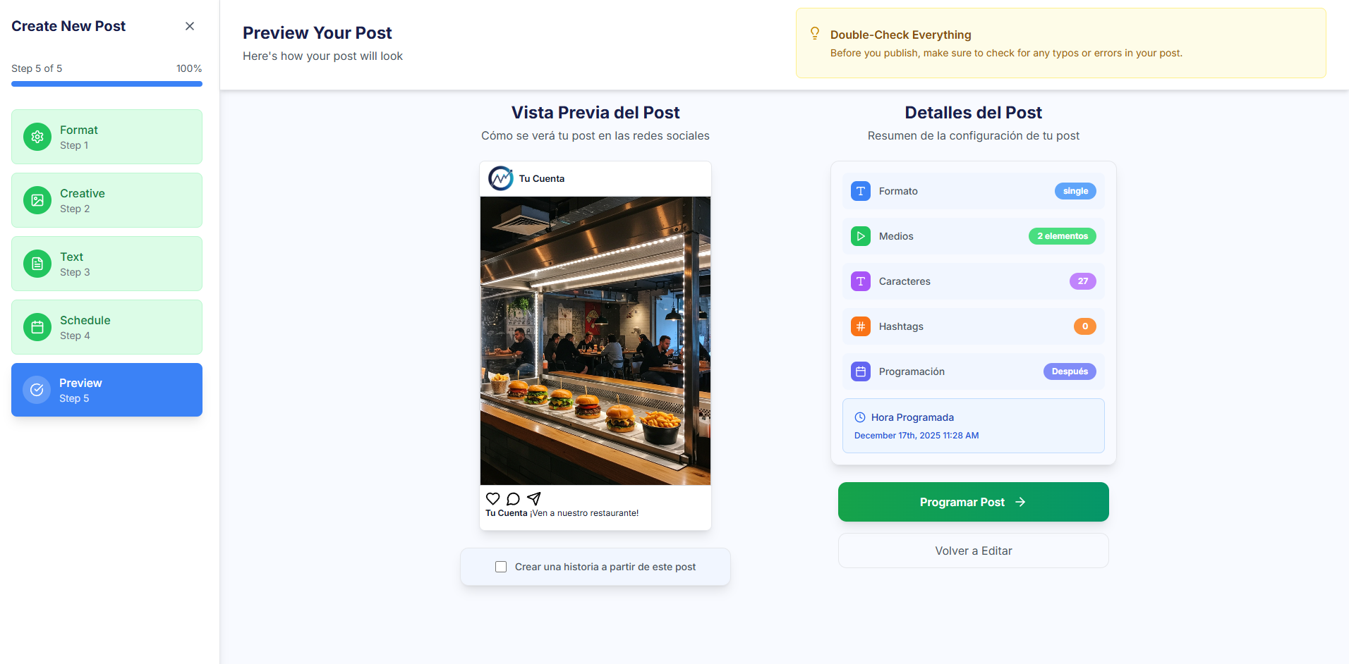 - Post Details: Summary of all the settings (Format, Media, Schedule, etc.).