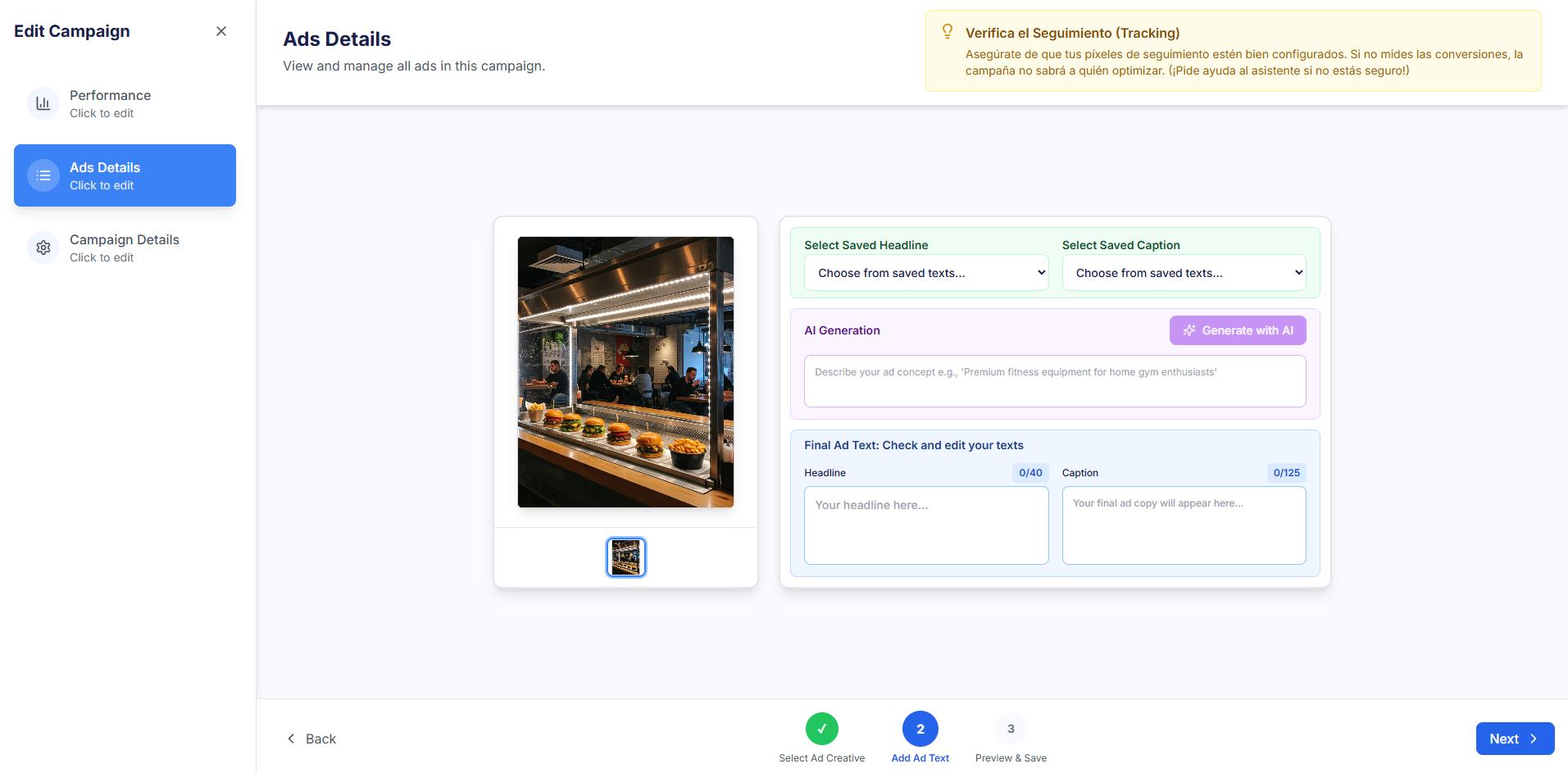 - Step 2: Copywriting (Text): You write the main text and the Call to Action. You can use AI suggestions to improve the click-through rate.