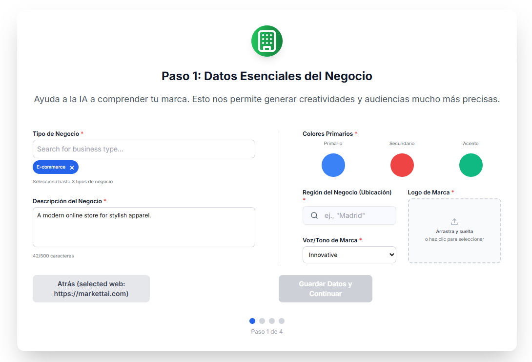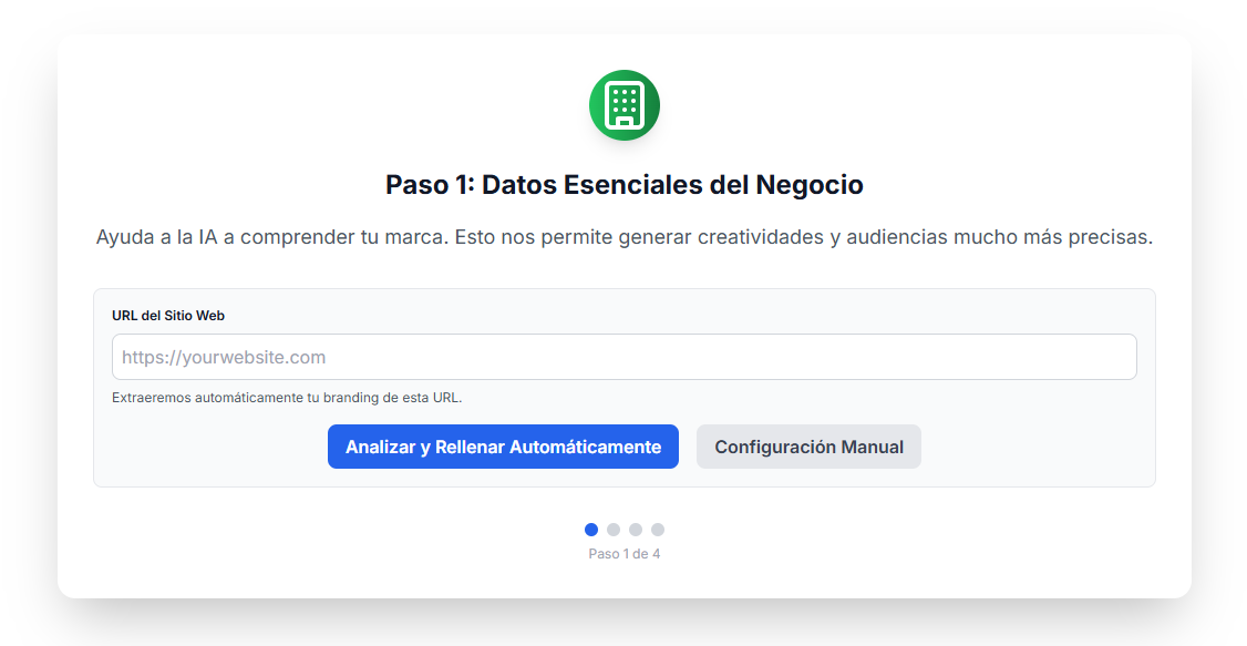 Esta información es crucial para que la IA genere creatividades y textos publicitarios con la voz correcta de tu negocio. Completa los siguientes campos: