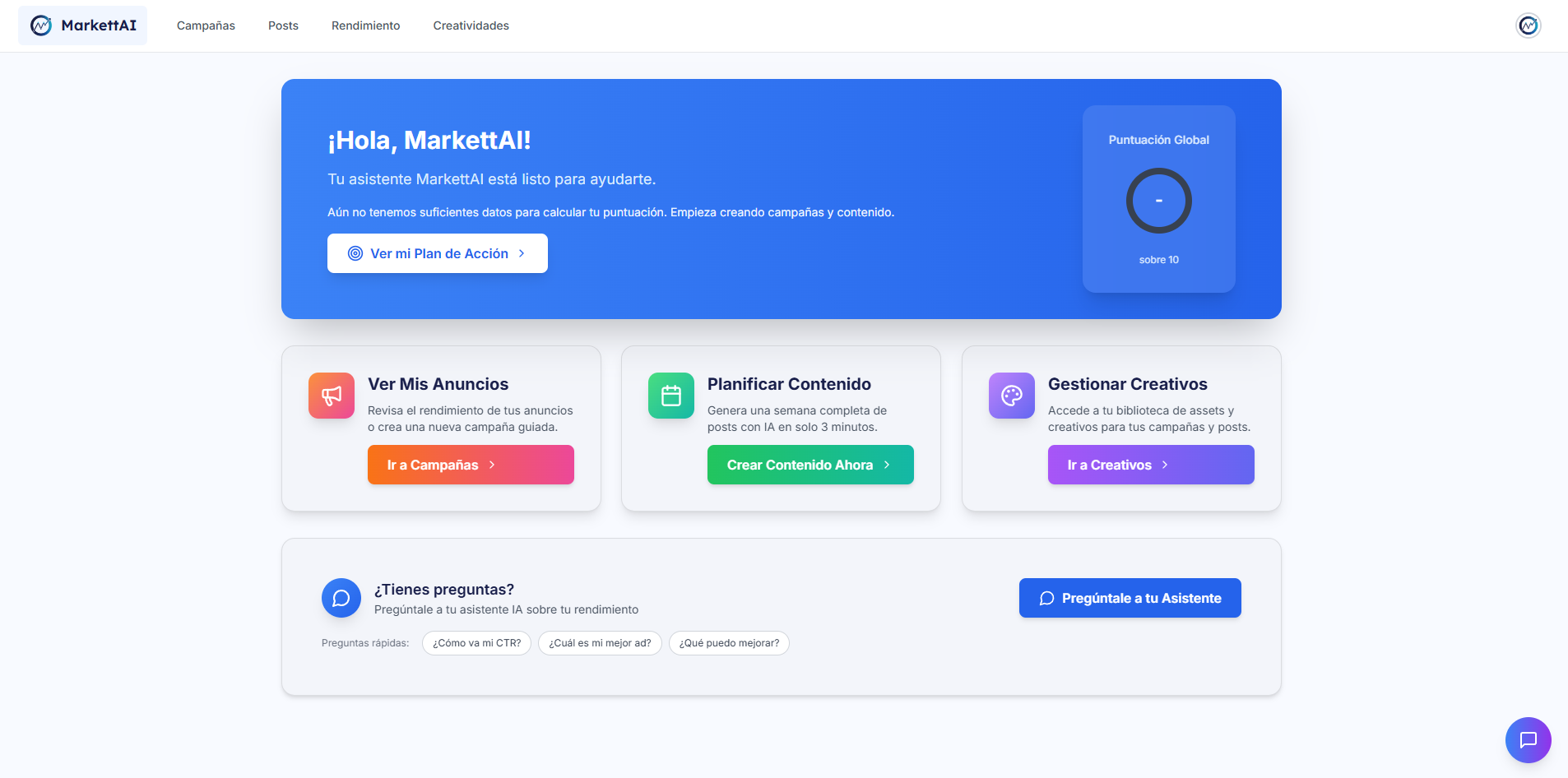 El Dashboard (o vista Home) es el punto de partida de tu plataforma MarkettAI. Está diseñado para ofrecerte un resumen ejecutivo del estado de tu negocio y los accesos directos clave para tomar acción, adaptándose completamente a tu Modo de Conocimiento (Guiado o Experto).