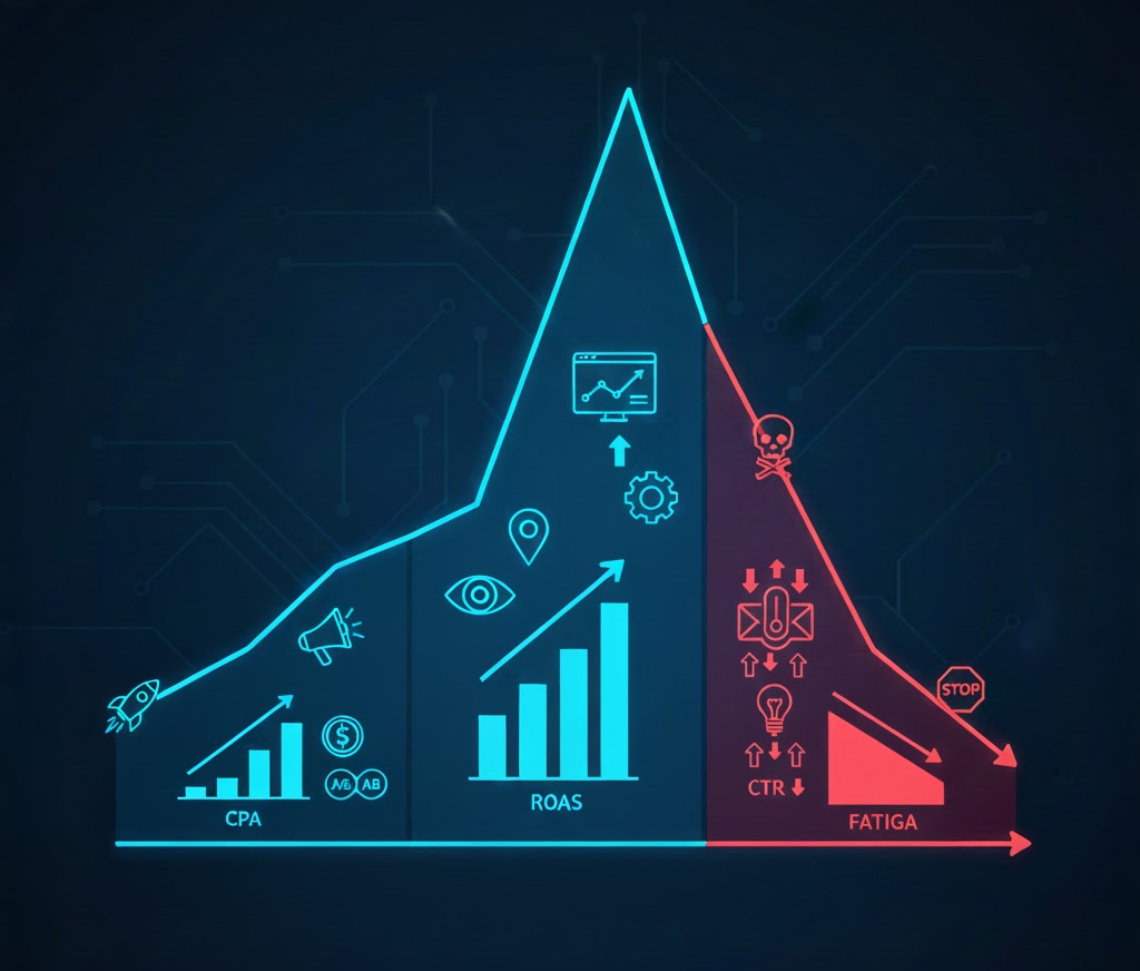 Esta fase es inevitable. Con el tiempo, la audiencia se cansa de ver el mismo anuncio, lo que lleva a la Fatiga Creativa. Si no se actúa, el CPA se dispara y pierdes dinero.